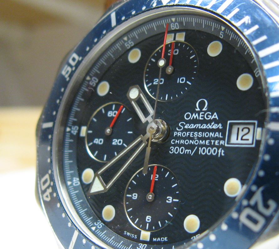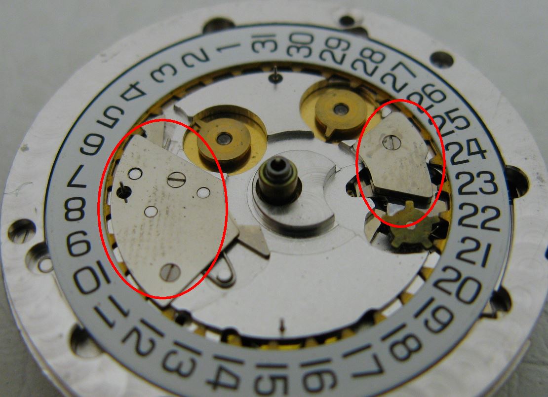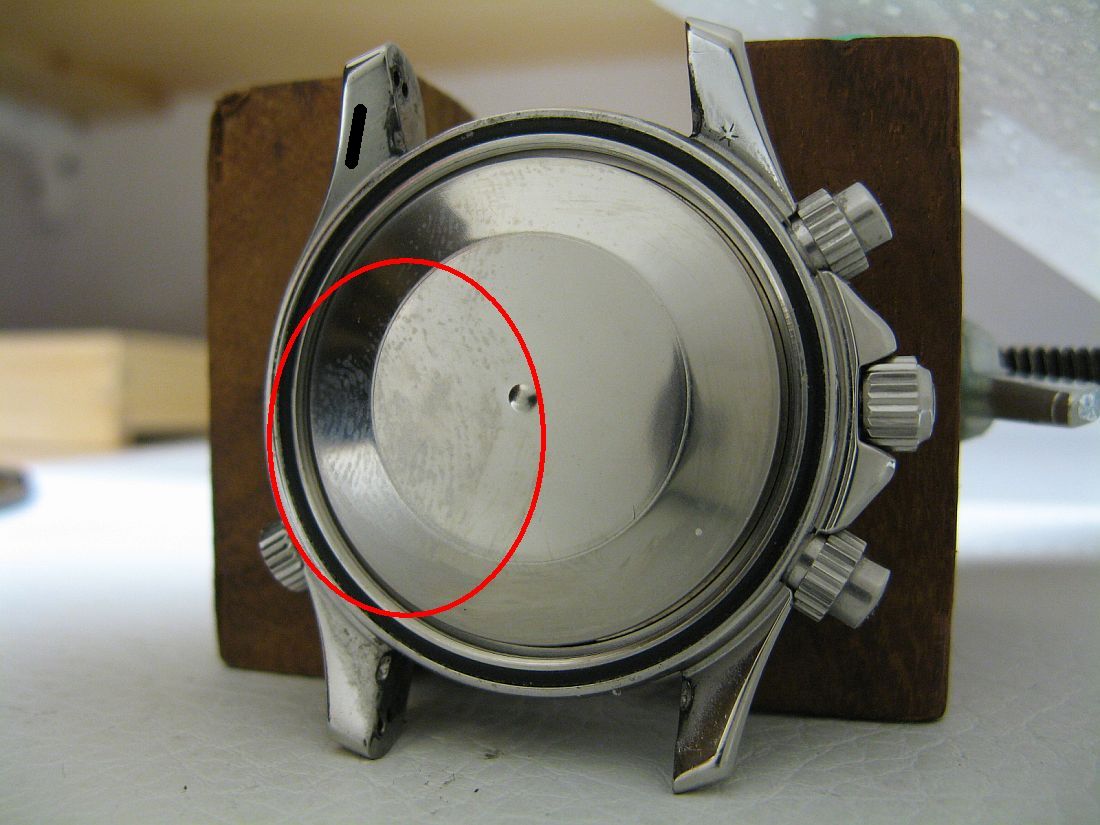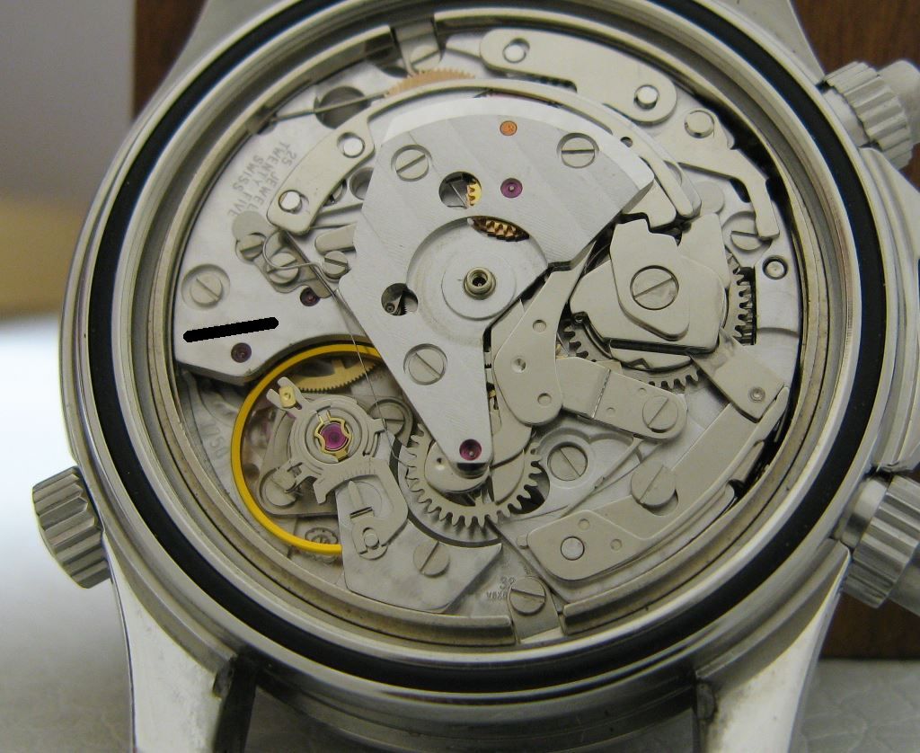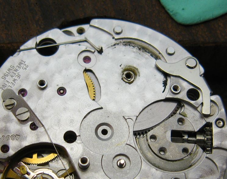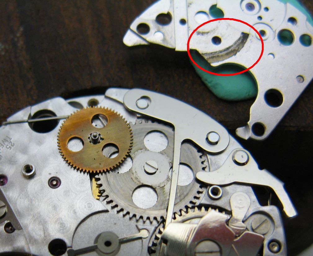 Hier hat das Sperrad, bedingt durch ein etwas eingelaufenes Federkernlager, schon Abrieb an der Unterseite der Chrono-Brücke verursacht.